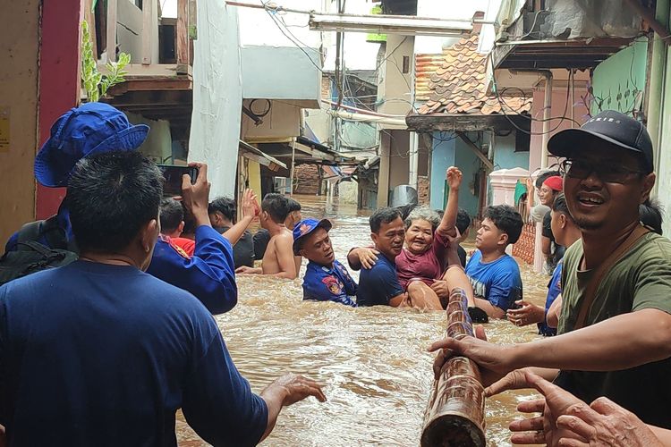 Tak hanya itu,petugas gabungan juga mengevakuasi lansia yang terjebak di lantai dua rumah. Lansia itu kesulitan keluar rumah karena arus dari Kali Ciliwung sangat deras.