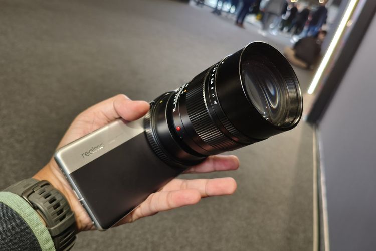 Kompas.com/BILL CLINTEN Ponsel Realme Interchangeable-Lens dengan mounting ditampilkan di booth Realme di ajang MWC Barcelona 2025,Selasa (4/3/2025).