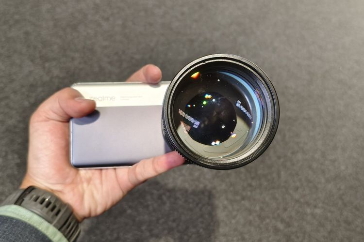 Kompas.com/BILL CLINTEN Ponsel Realme Interchangeable-Lens bersama lensa telefoto yang telah dipasang,Selasa (4/3/2025).