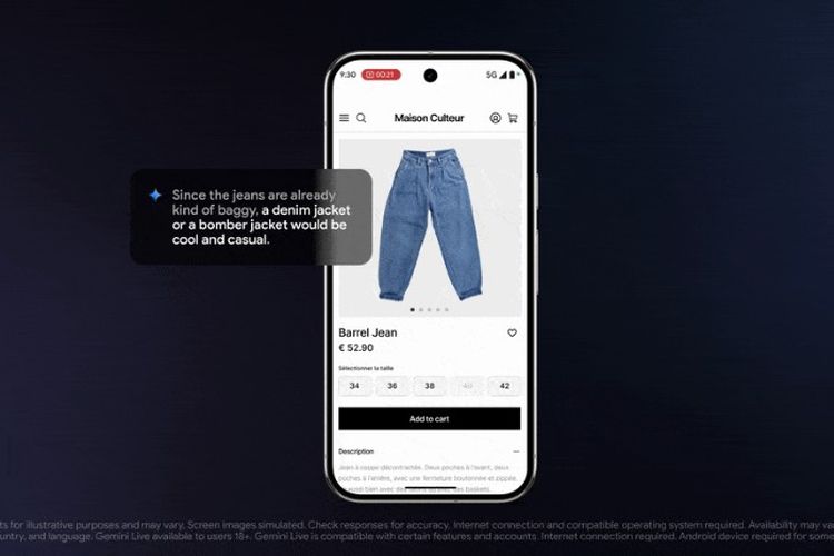 Dalam video yang dibagikan Google,seorang pengguna sedang menelusur celana jeans di sebuah toko daring. Dia kemudian bertanya ke Gemini tentang outfit apa yang cocok dengan celana tersebut.