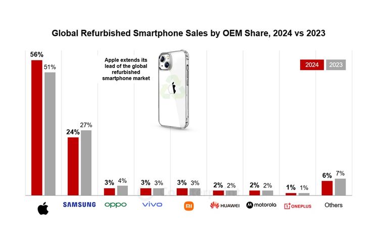Nah,menurut Counterpoint,iPhone merupakan HP bekas yang paling laris pada tahun 2024. Ponsel keluaran Apple ini menguasai pangsa 56 persen di pasar HP bekas pada tahun tersebut. Persentasenya meningkat dibanding 51 persen pada tahun 2023 lalu.