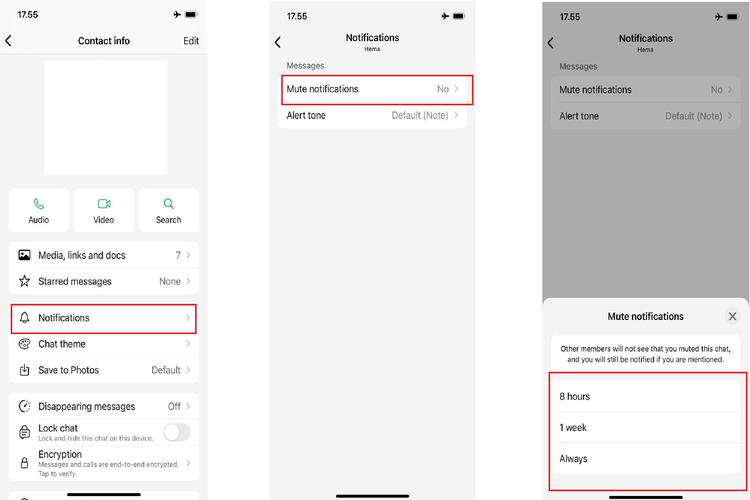 Atur durasi notifikasi kontak dibisukan,bisa selama delapan jam,satu minggu,dan selamanya.