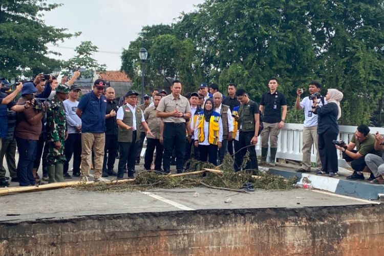 BEKASI,KOMPAS.com - Wali Kota Bekasi,Tri Adhianto,bersama Menko Bidang Pembangunan Manusia dan Kebudayaan,Pratikno,Menko Infrastruktur dan Pembangunan Kewilayahan Agus Harimurti Yudhoyono (AHY),serta Kepala BNPB Suhariyanto meninjau jembatan yang ambles di Kemang Pratama,Bekasi,pada Kamis (6/3/2025) sekitar pukul 12.05 WIB.