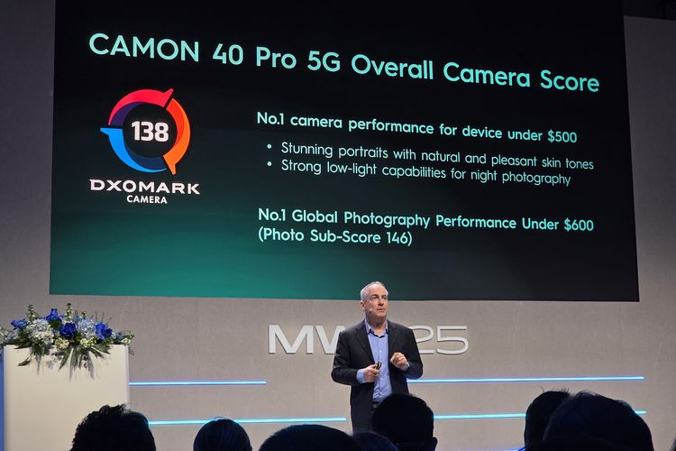 "Camon 40 Pro 5G mencapai skor kamera yang luar biasa,yakni 138 poin. Ini menjadikannya sebagai HP dengan ranking kamera terbaik di segmen HP di bawah 500 dollar AS," kata Guichard.